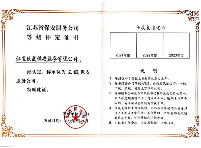 江蘇玖晟保安服務有限公司成立于江蘇省昆山市千燈鎮。注冊資金:2000萬,是擁有省公安廳頒發(fā)的保安服務許可證的企業(yè)【蘇公保服20170046】,也是昆山市保安協會常務理事單位。